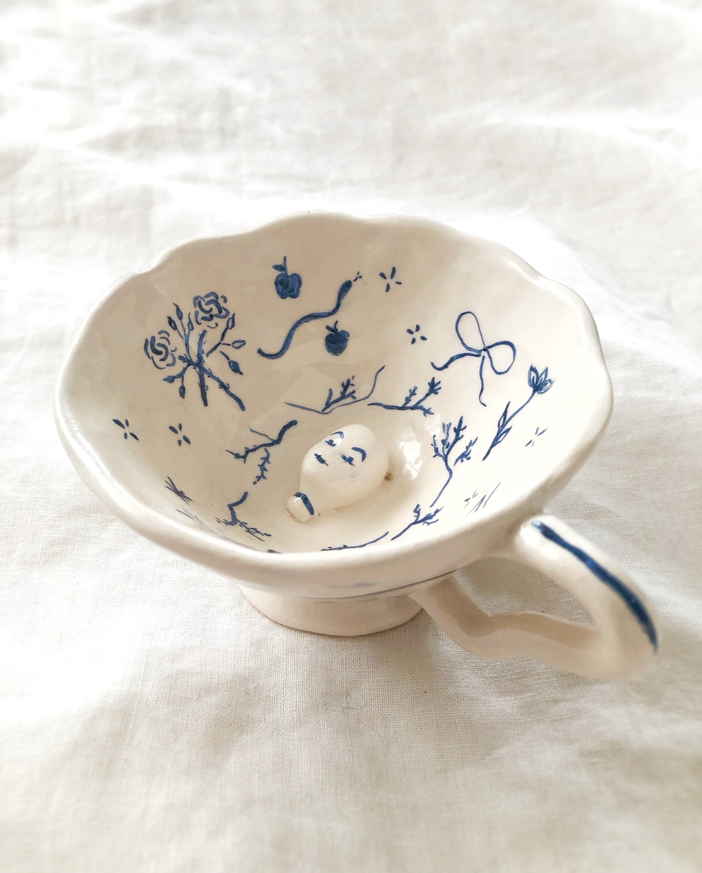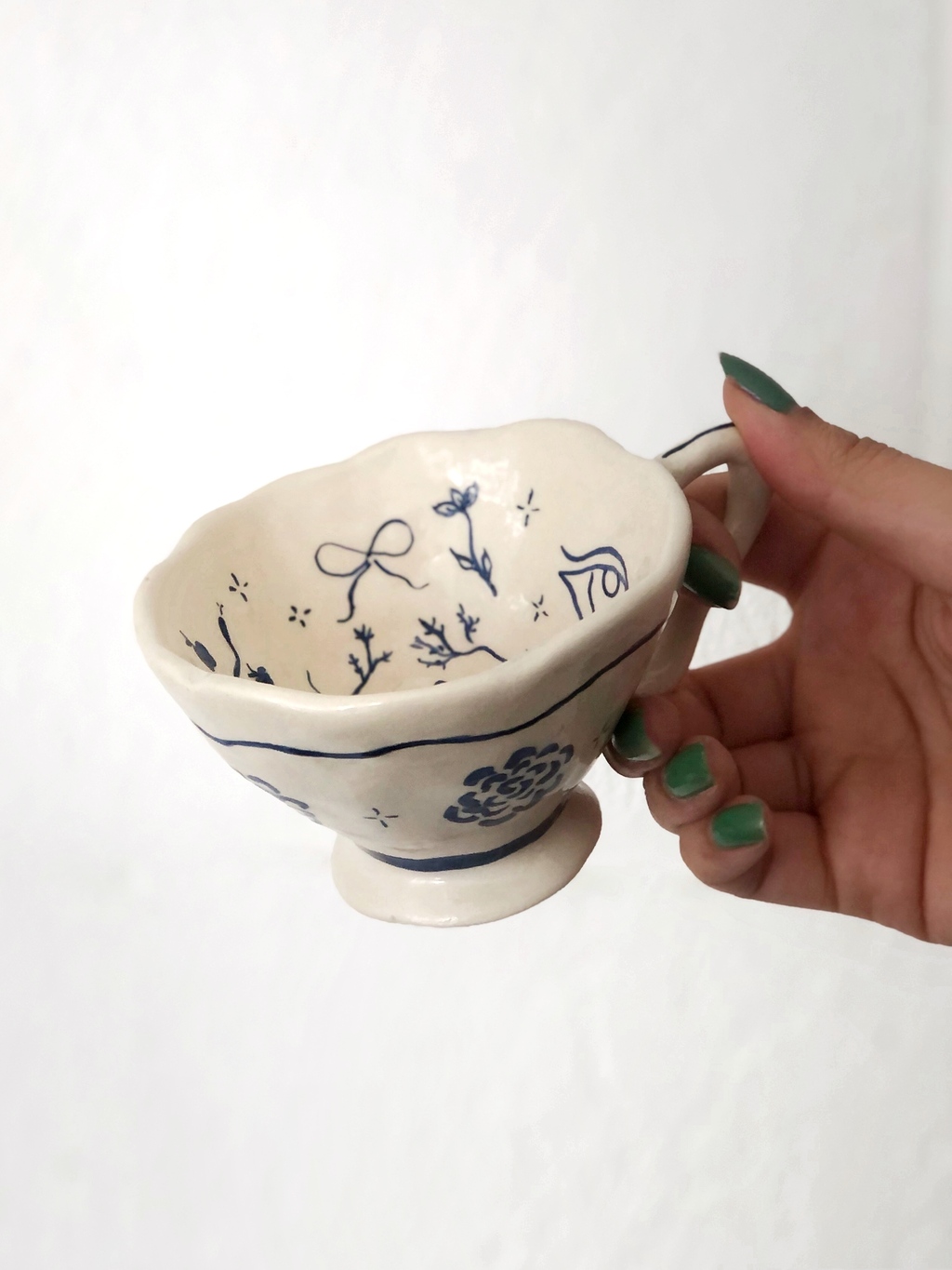 Taza de té de cerámica realizada, pintada y esmaltada totalmente a mano. En alguna parte del proceso se manchó un poquito con la pintura azul y por eso está con descuento.